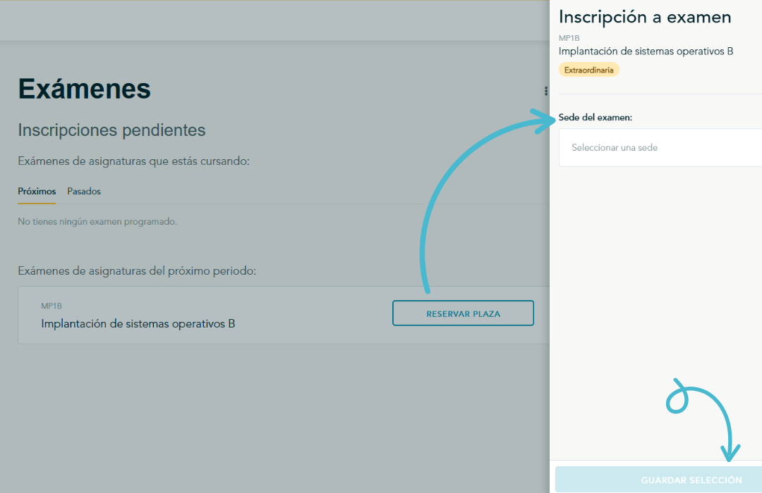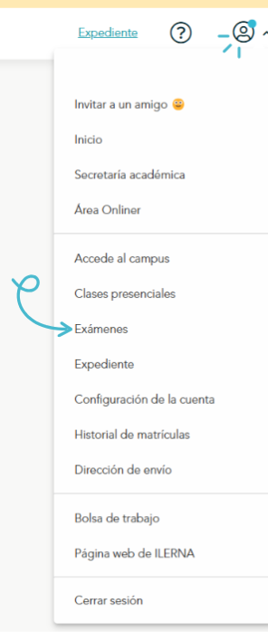 En menú desplegable que encontrarás clicando en tu foto, arriba a la derecha, podrás ver el apartado "Exámenes". Dentro de esta pestaña, podrás seleccionar la sede y fecha que más te convenga para examinarte de cada una de las asignaturas y finalizar tu inscripción.