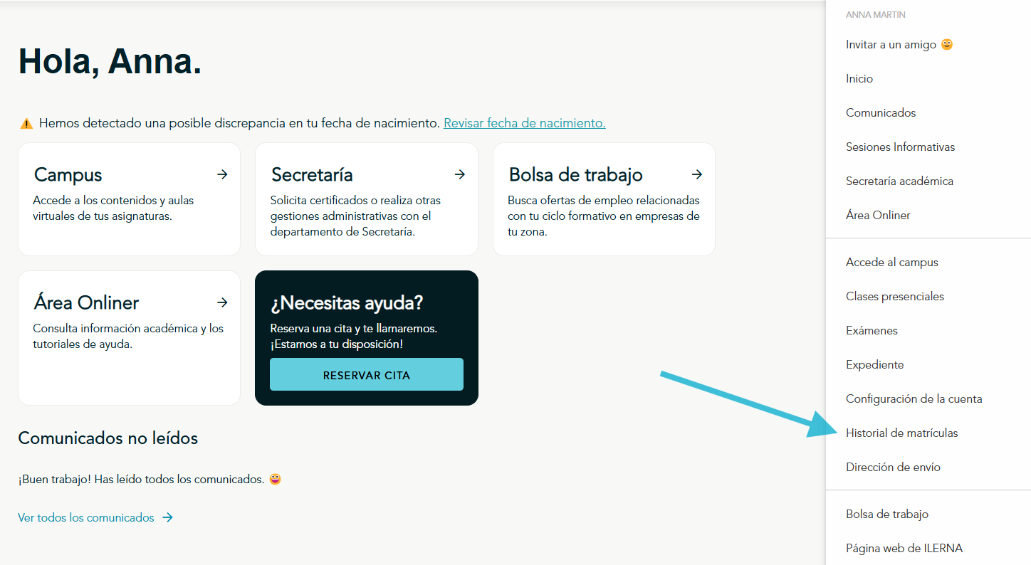 En el inicio de 'Mi Cuenta' verás el apartado de Comunicados. Aquí te llegarán los avisos generales de iLERNA, así como aquella información referente a tus trámites. Los mensajes no leídos aparecen marcados con un punto azul. Haciendo clic en los ...